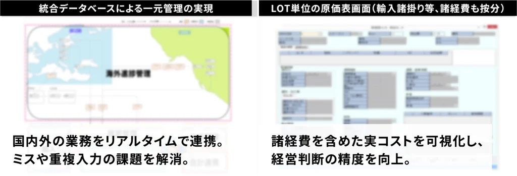 特に、海外の原料調達から加工・通関・出荷に至るまでの進捗や原価などのデータが散在し、経営判断に必要な情報をリアルタイムに把握することが難しい状況でした。